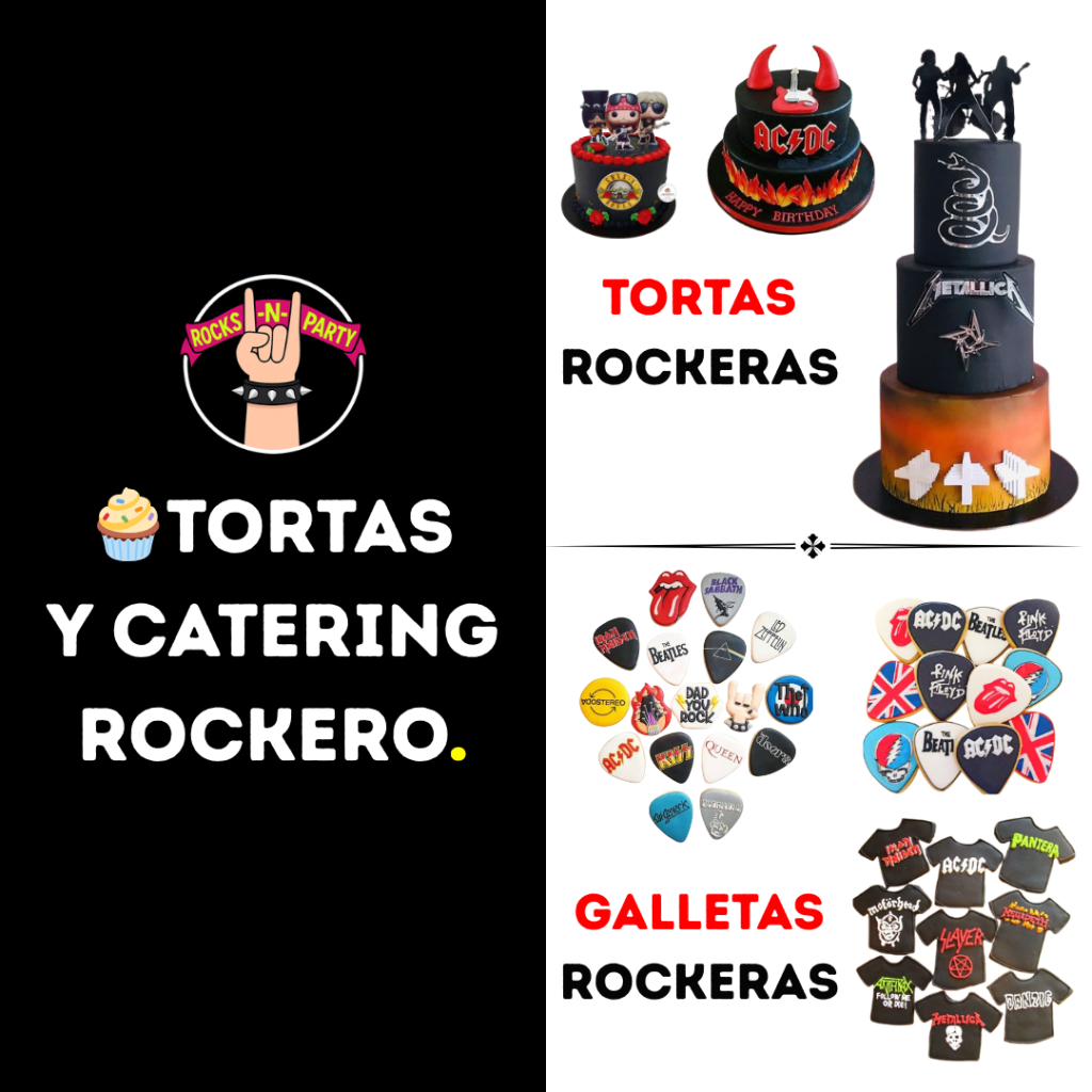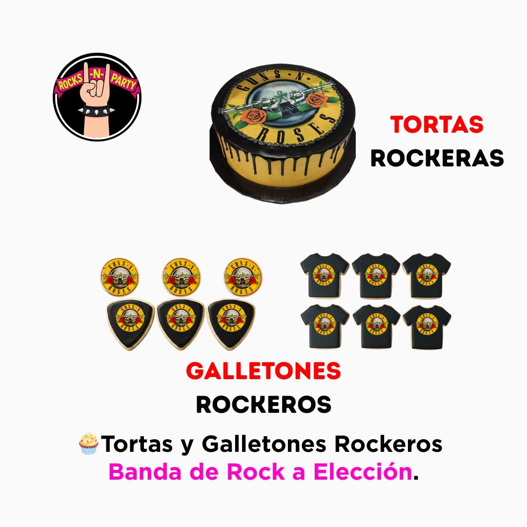 🧁Galletones Rockstar (Uñetas y Camisetas de Bandas de Rock) y Tortas Rockeras de 1 hasta 3 Pisos Diseños a Elección.